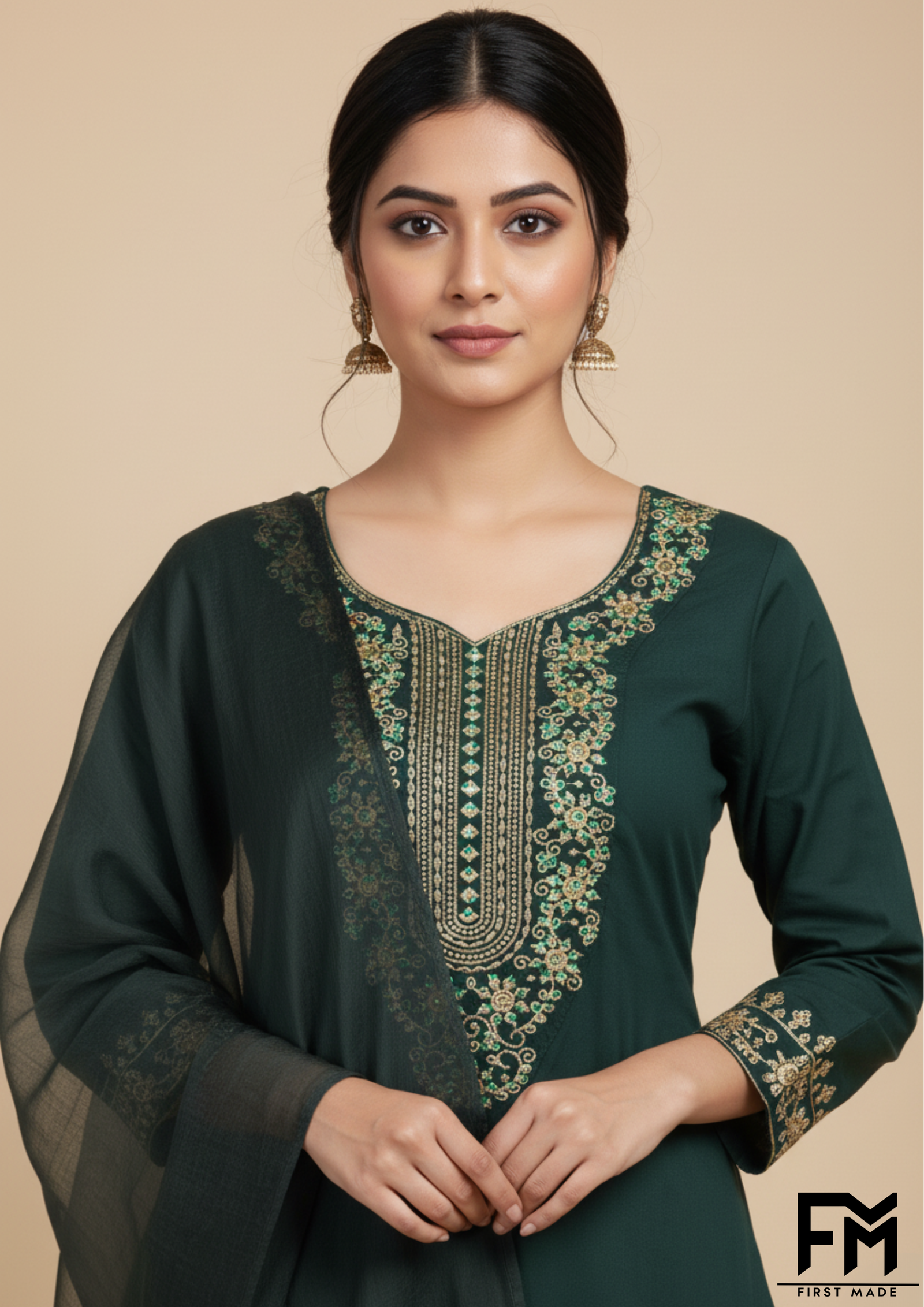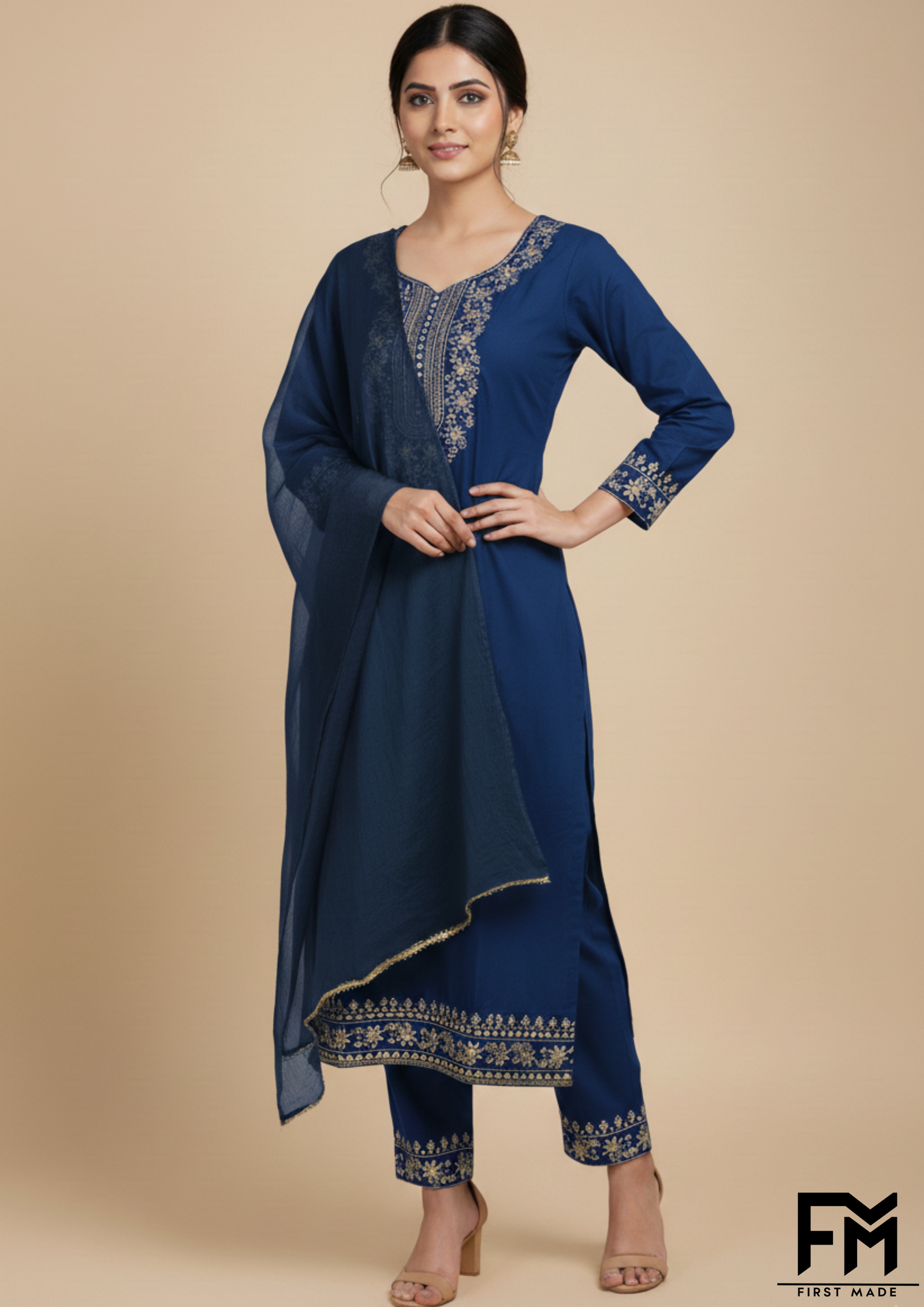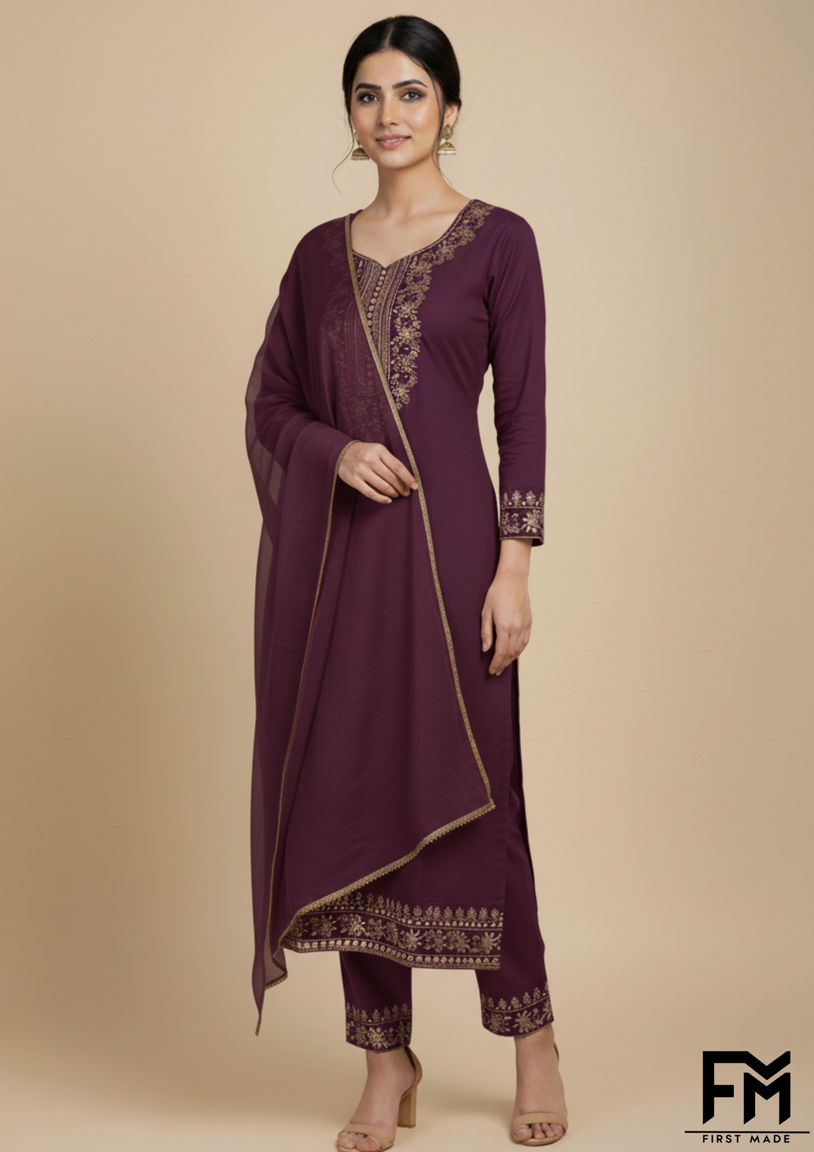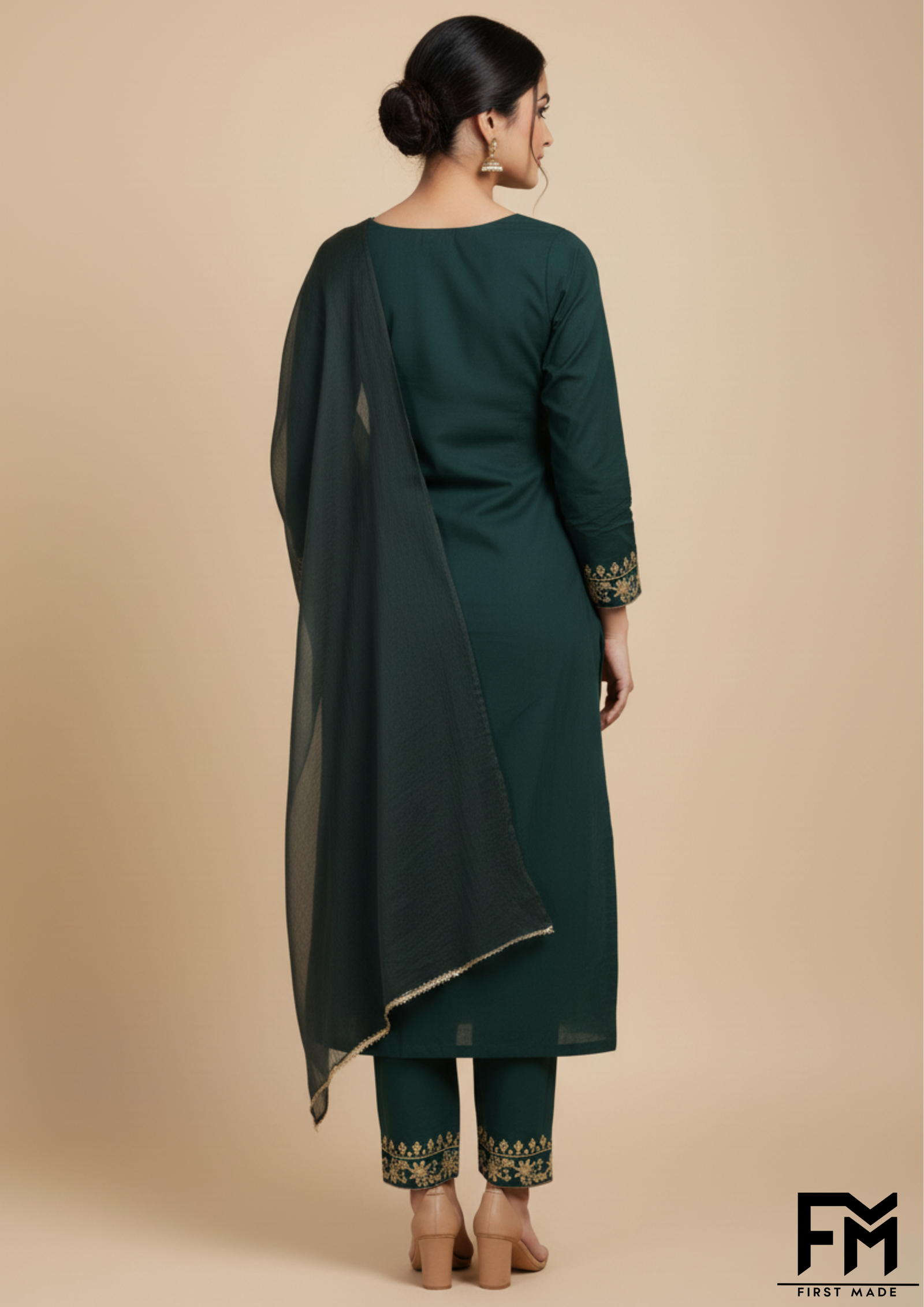 Introducing a stunning three-piece suit set from FM First Made, designed to bring timeless elegance to your wardrobe. The ensemble includes a straight-cut kurta, matching trousers, and a lightweight dupatta. The kurta features a round neckline with a subtle V-slit, beautifully adorned with intricate embroidery in a delicate thread, adding a touch of sophistication. This detailed work is mirrored on the full-length sleeves and the hemline of the trousers, creating a cohesive and polished look. The fabric drapes gracefully, offering both comfort and style. The accompanying dupatta is crafted from a sheer, flowing material, finished with a fine, embroidered border that perfectly complements the suit. This set is available in a versatile range of rich jewel tones—a deep mustard yellow, a bold royal blue, a regal maroon, and a serene forest green—making it a perfect choice for festive occasions, formal gatherings, or any special event where you want to make a refined statement.
