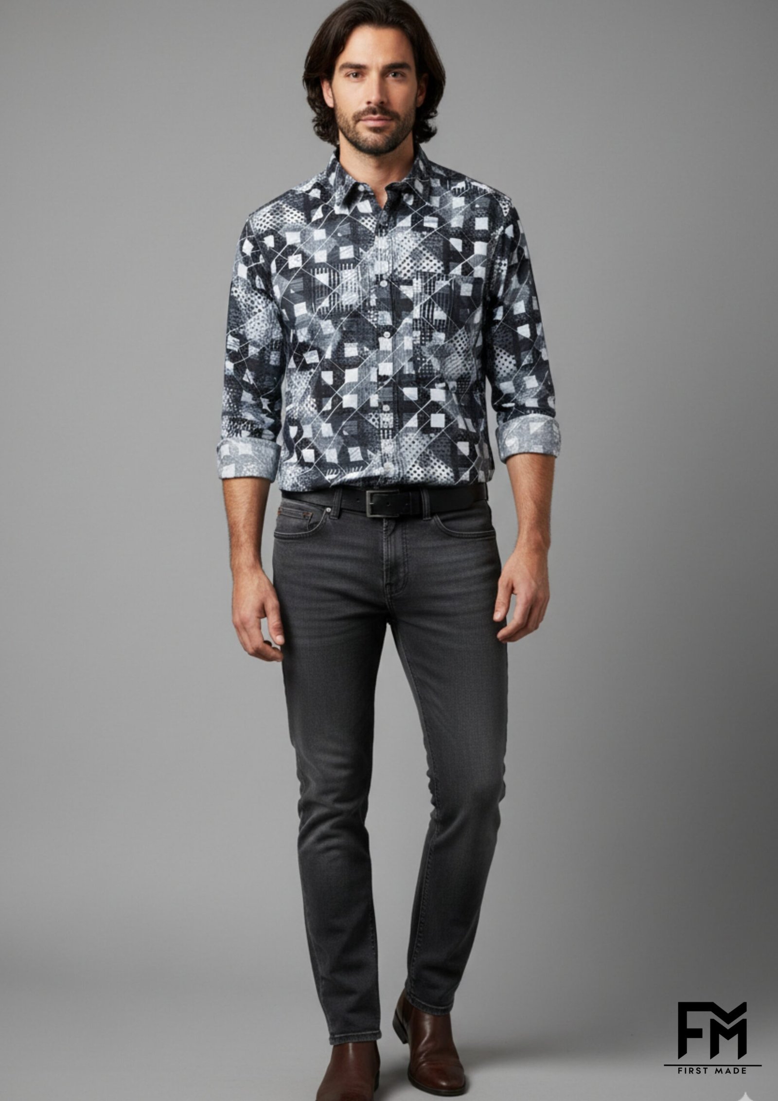 Elevate your style with this monochrome geometric print shirt, designed for the modern man who values both comfort and sophistication. Crafted from premium-quality fabric, this full-sleeve shirt features a unique mix of abstract patterns in shades of black, white, and grey. Perfect for both casual outings and semi-formal events, it pairs effortlessly with denim or trousers. Rolled-up sleeves add a relaxed touch, while the tailored fit ensures a sharp, contemporary look.