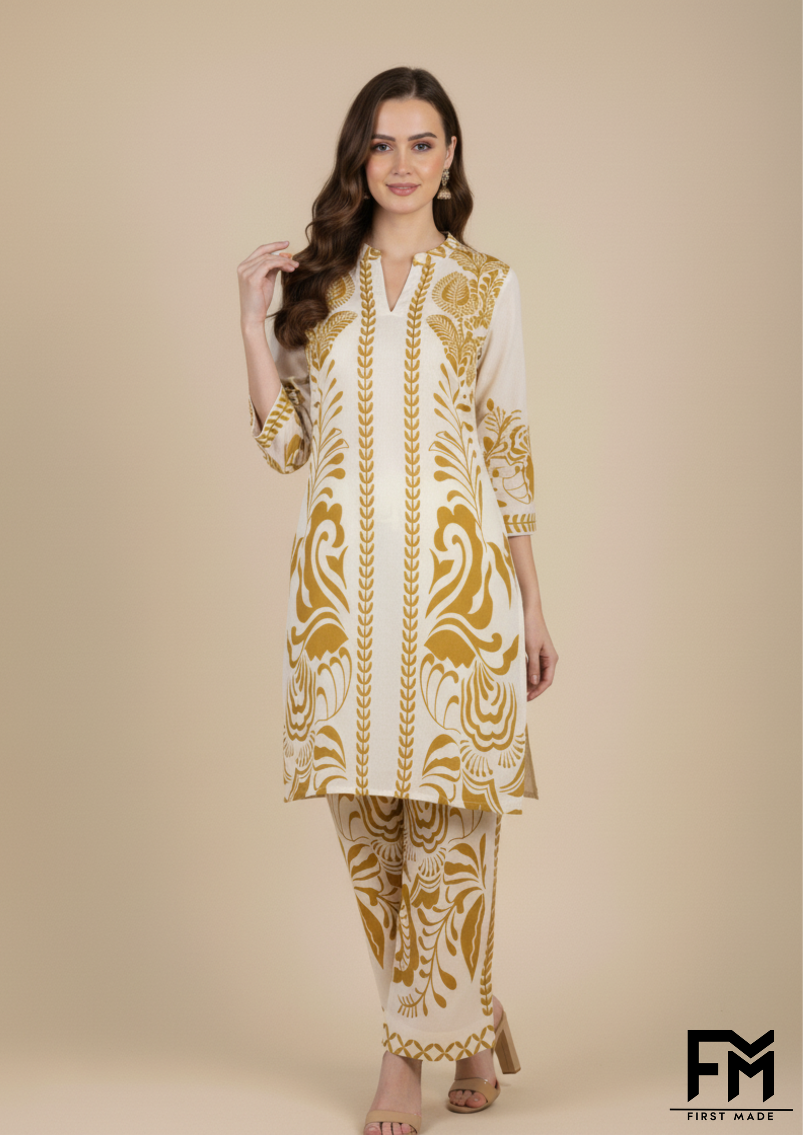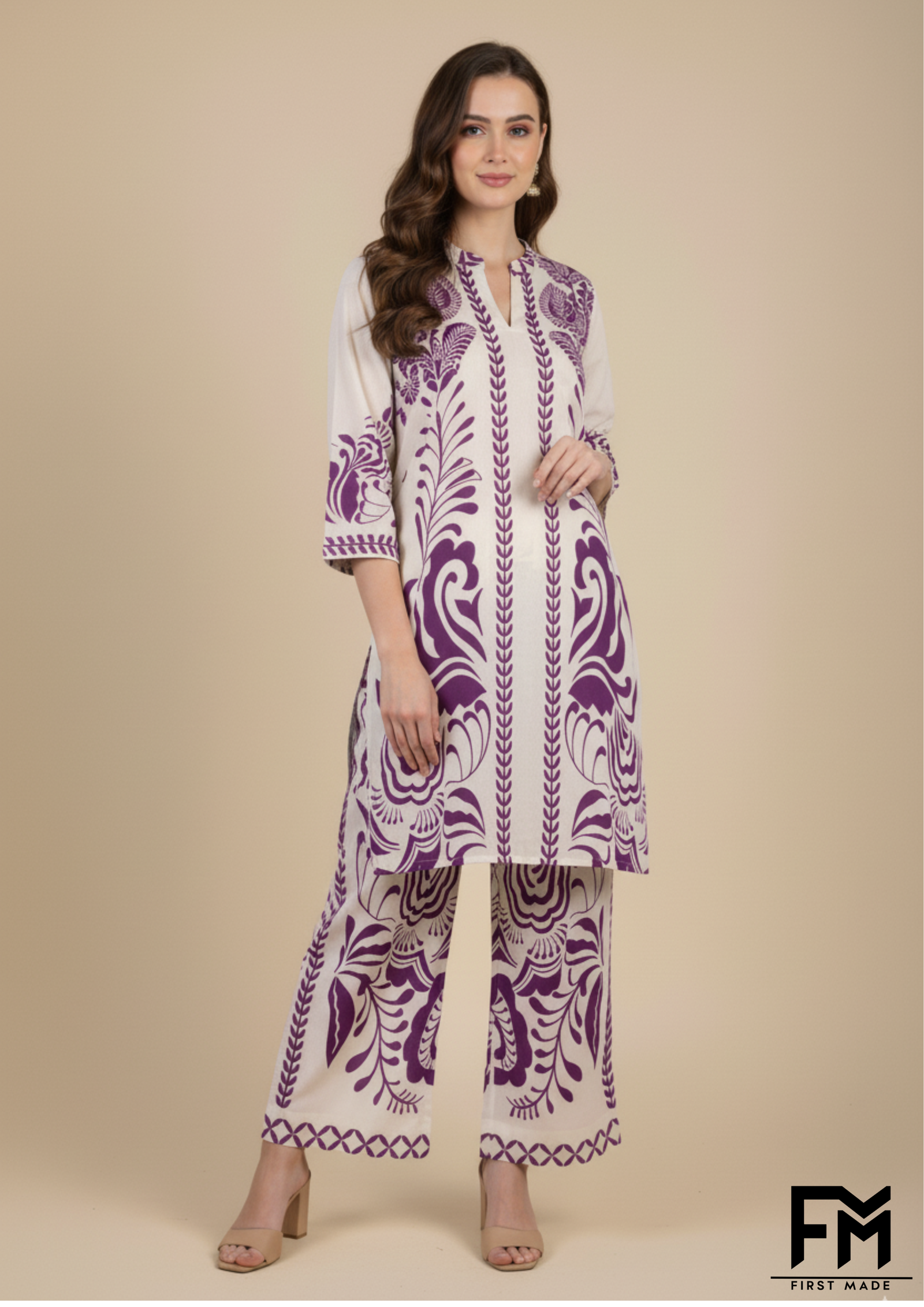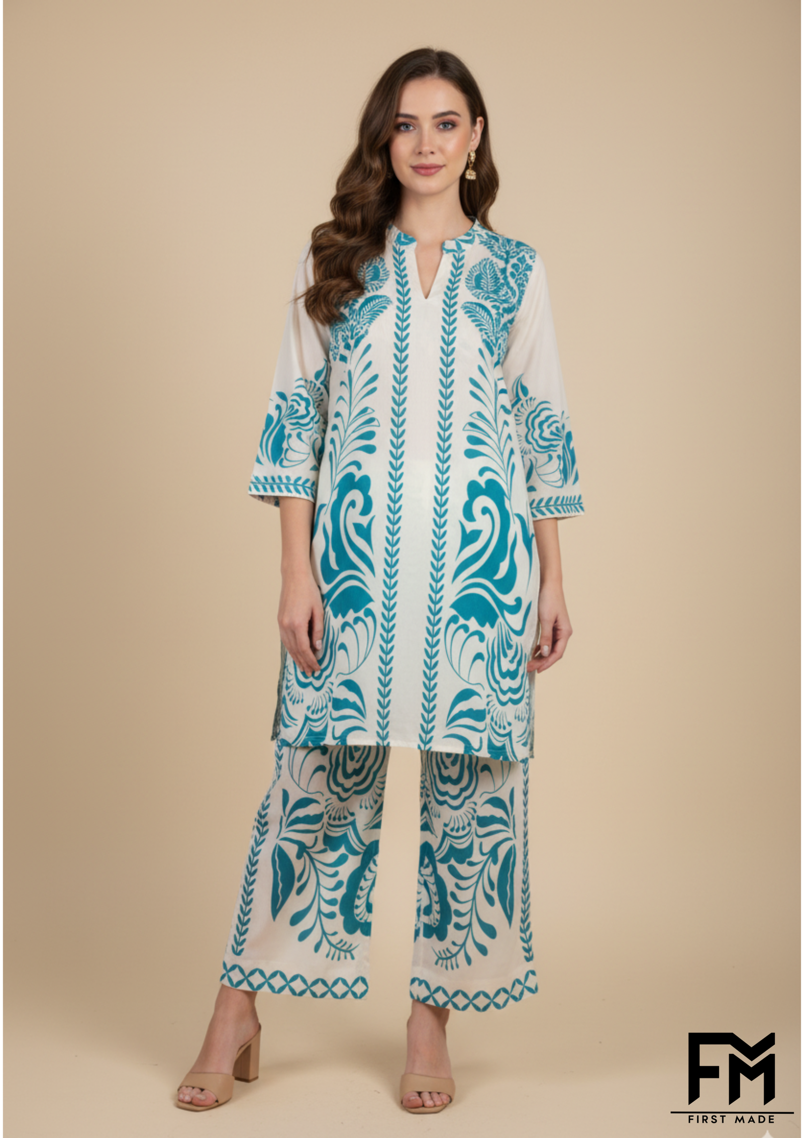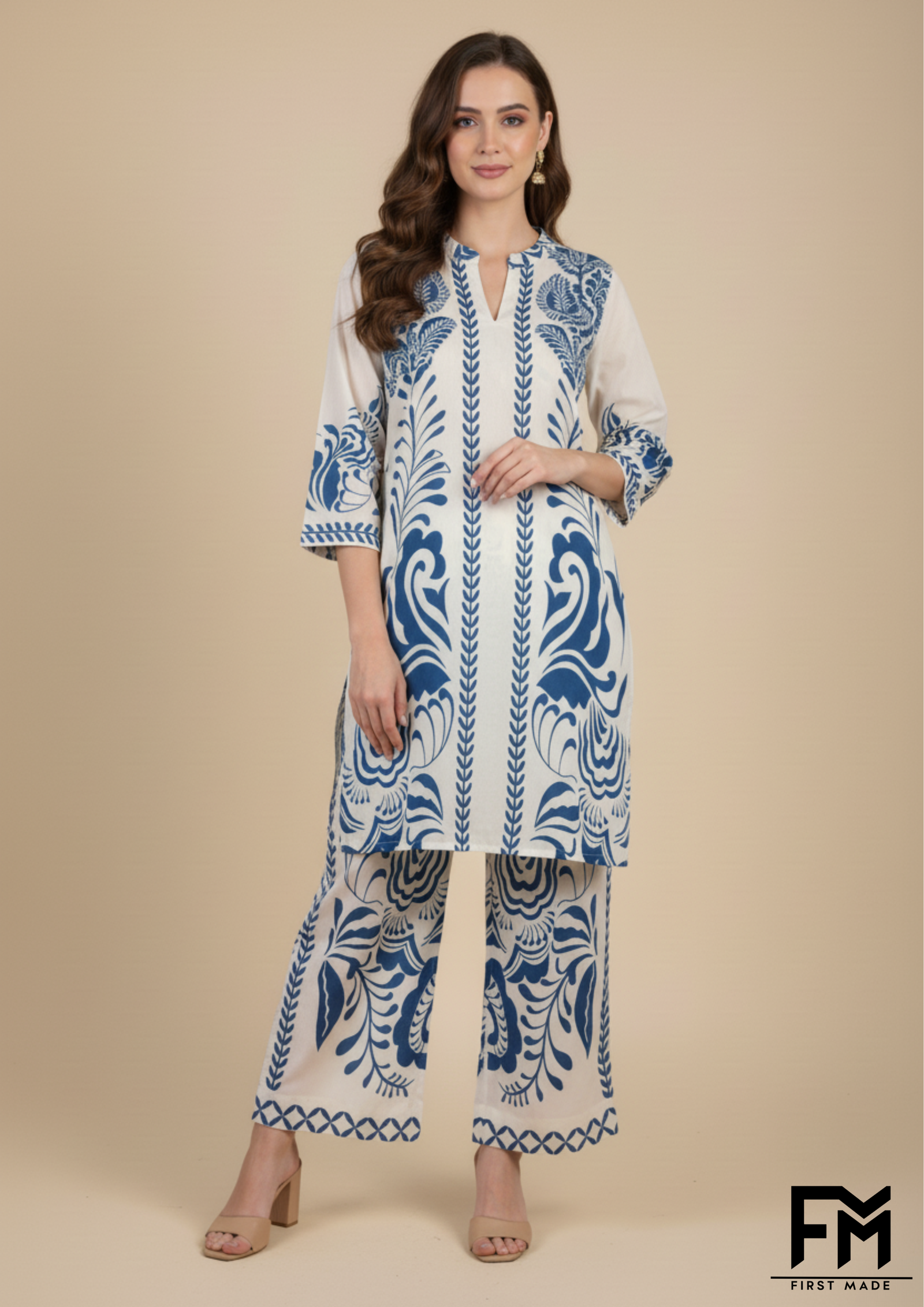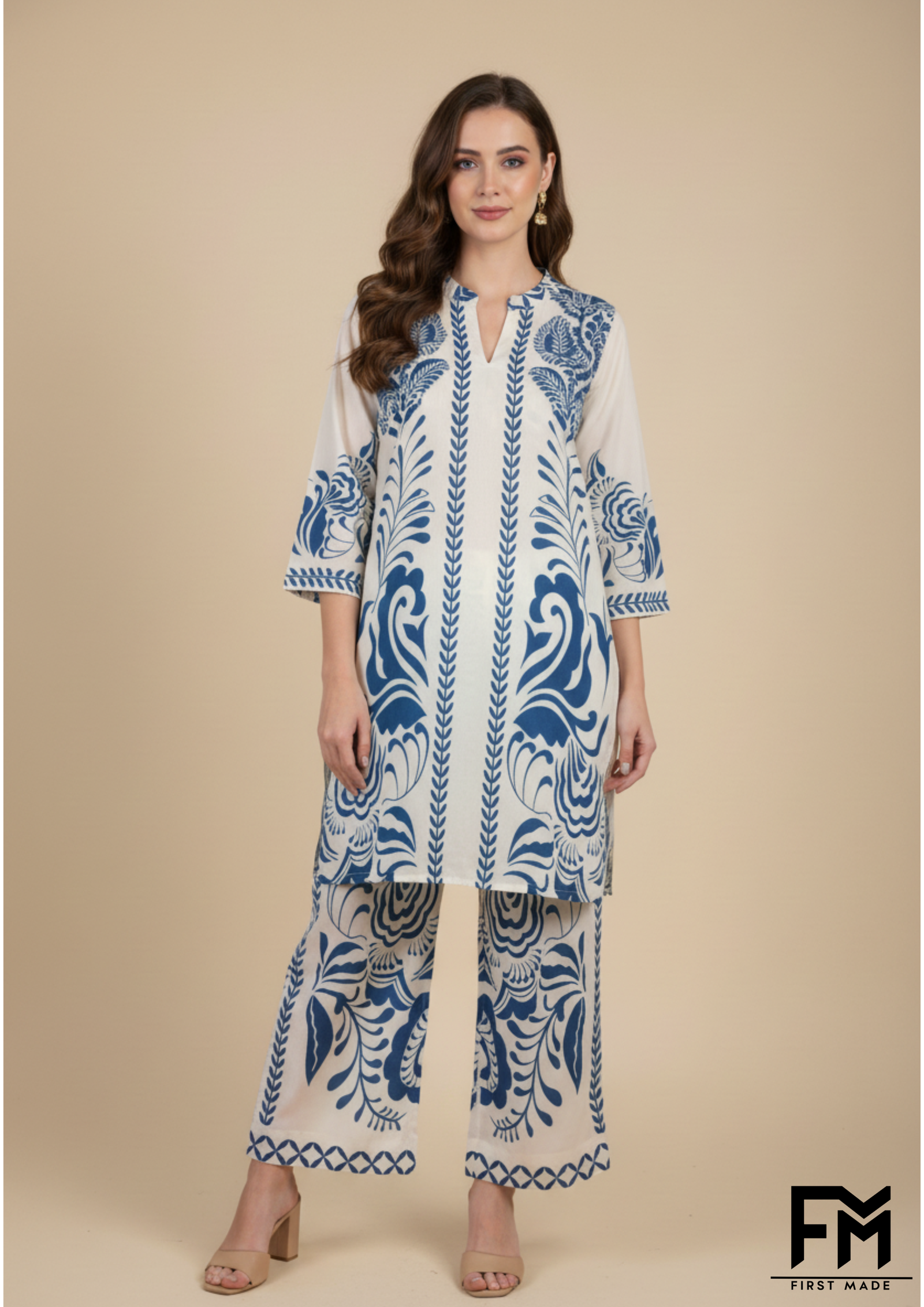 Presenting a stunning co-ord set from FM First Made, perfect for making a stylish statement. The set features a straight-cut, long-sleeved kurta with a banded V-neckline. The front is a beautiful collage of patterns and colors, blending geometric and intricate floral motifs in shades of blue and cream. The upper half is adorned with a detailed symmetrical design, transitioning seamlessly into a dark blue body embellished with large, vibrant white daisies that pop against the deep background. The sleeves are a lighter blue with a subtle, all-over floral pattern, finished with decorative cuffs that mirror the design on the top of the kurta. The matching straight-leg trousers feature a delicate border print at the hem, tying the entire look together. This ensemble expertly combines traditional prints with a contemporary silhouette, creating a versatile outfit that’s both elegant and effortlessly chic.