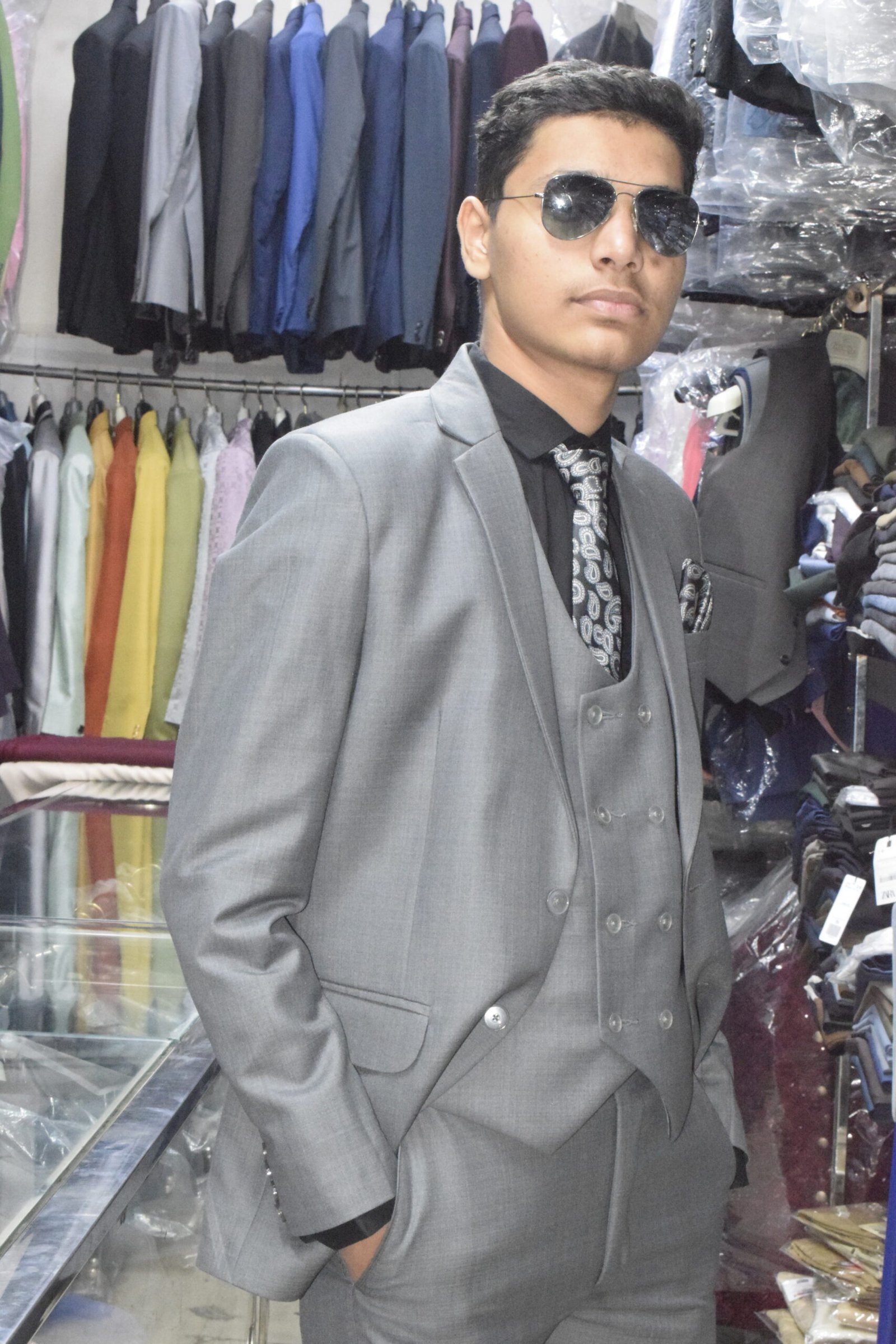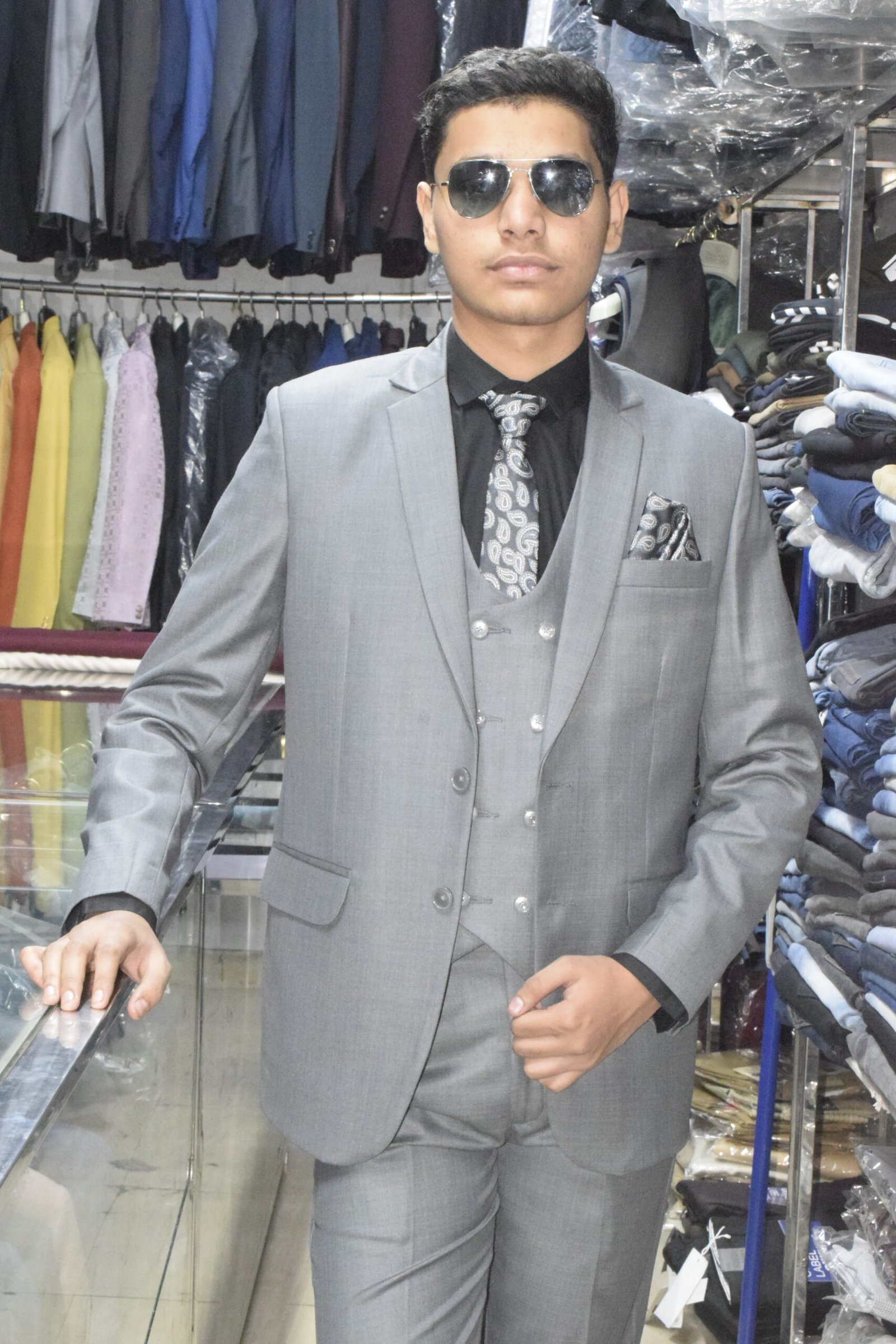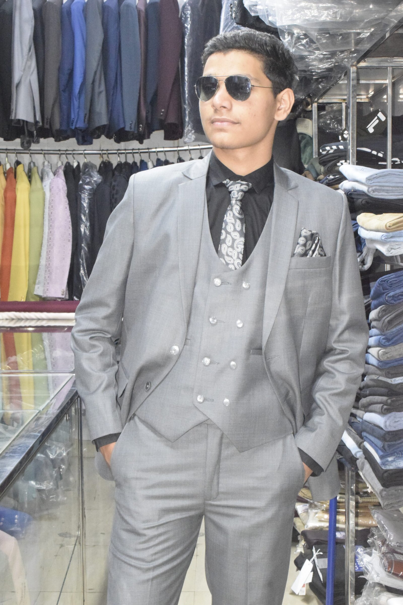 Elevate your formal style with this premium 3-piece grey suit set, designed for modern men who appreciate class and confidence. The suit includes a sharply tailored blazer, a double-breasted waistcoat, and matching trousers, paired with a black shirt, printed tie, and pocket square for a complete polished look. Crafted from high-quality fabric, this suit offers all-day comfort, a flawless fit, and timeless appeal—perfect for weddings, corporate events, and special occasions.