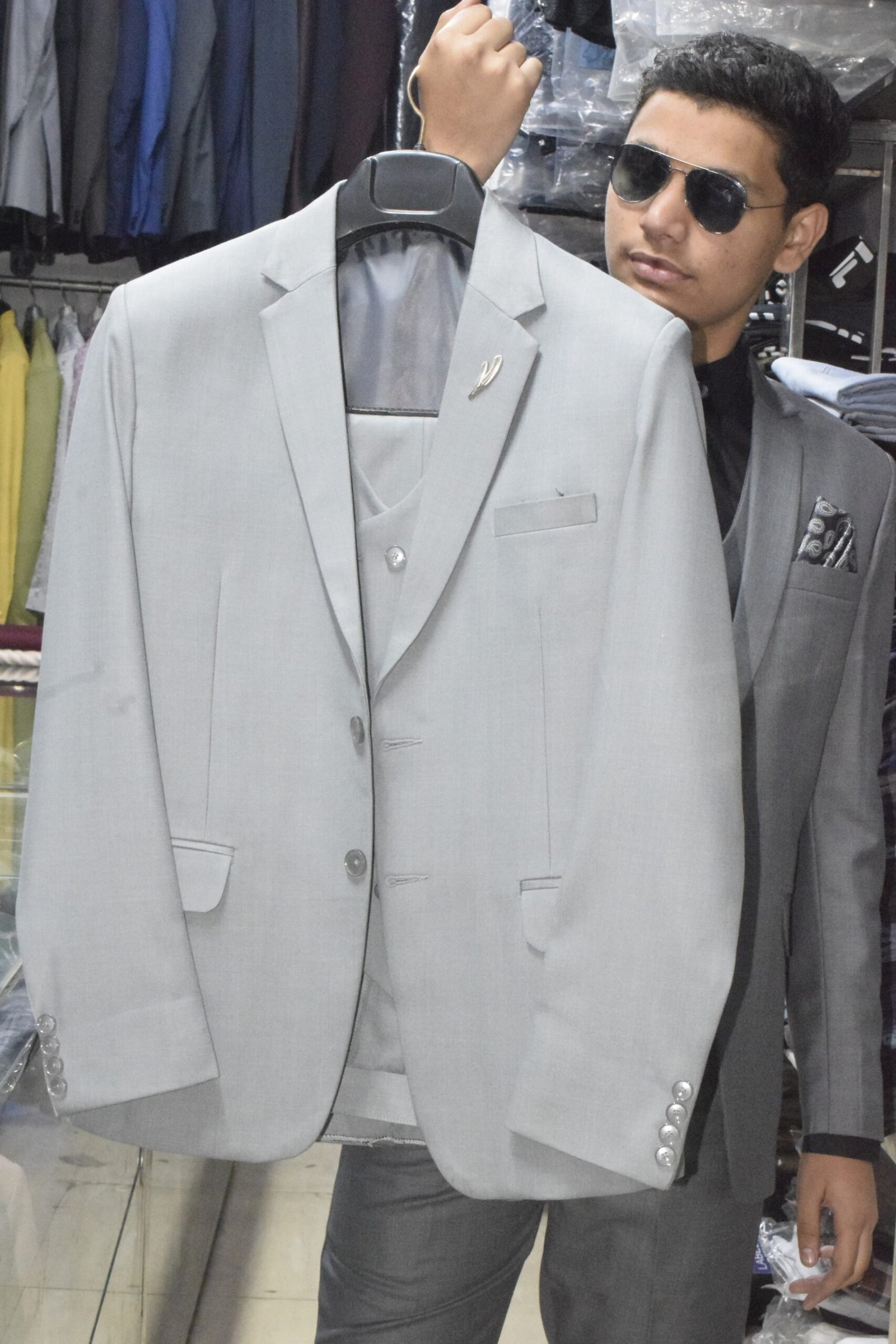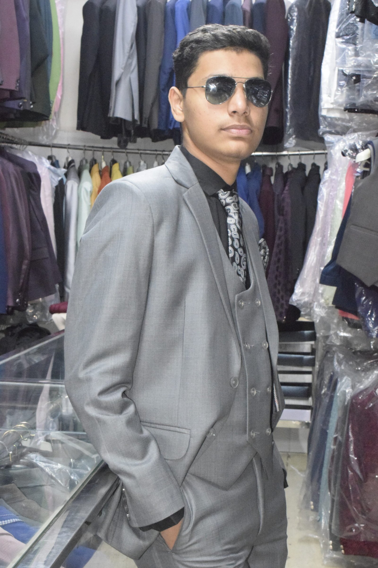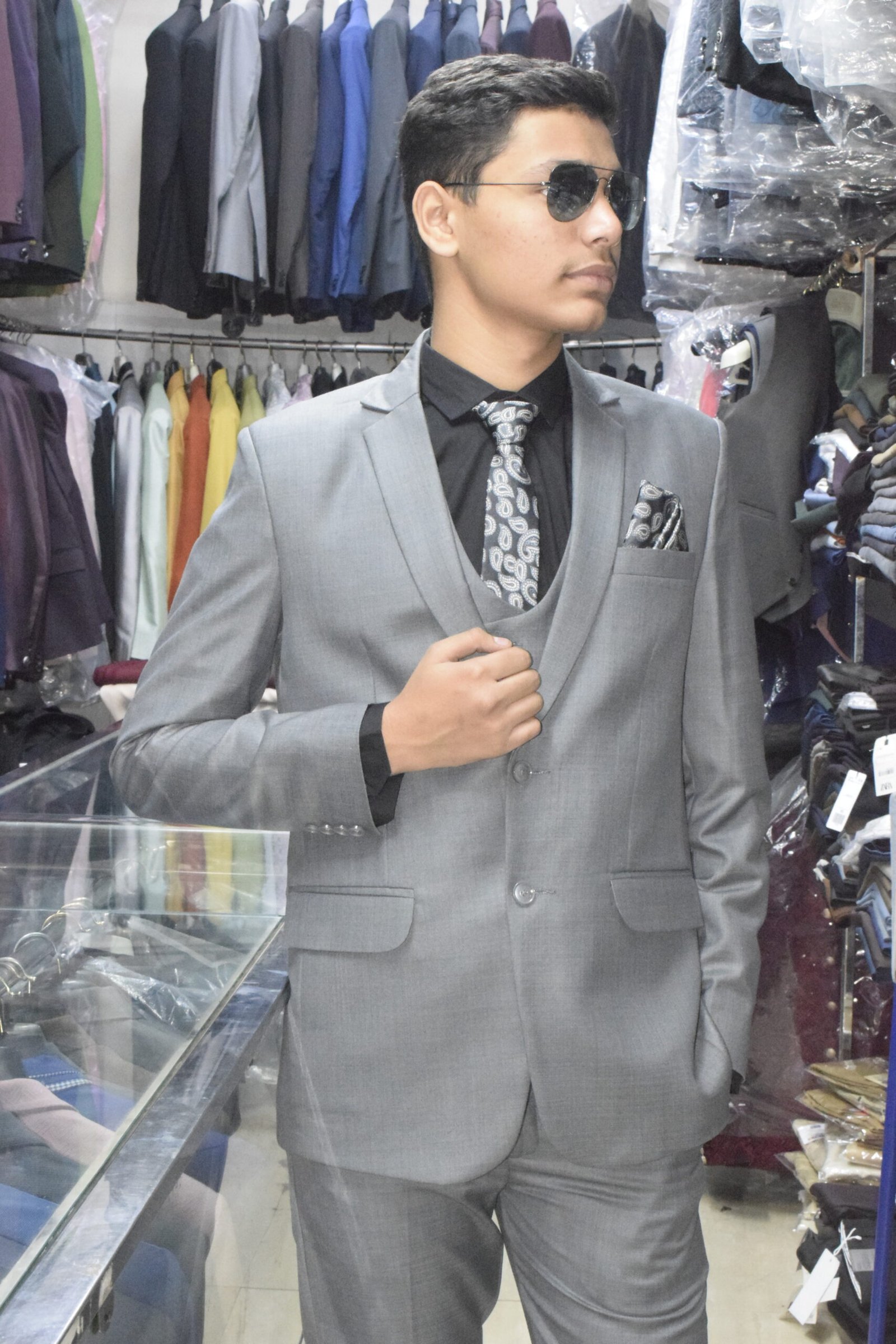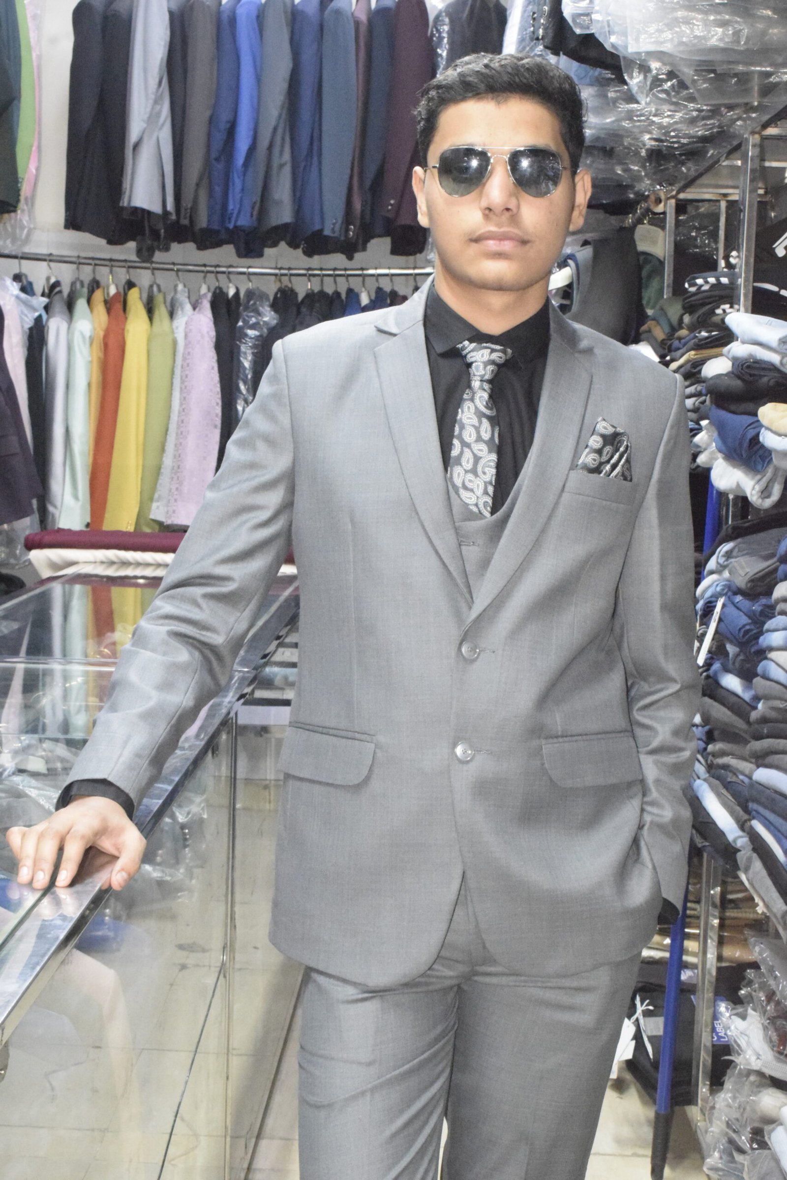 Elevate your formal style with this premium 3-piece grey suit set, designed for modern men who appreciate class and confidence. The suit includes a sharply tailored blazer, a double-breasted waistcoat, and matching trousers, paired with a black shirt, printed tie, and pocket square for a complete polished look. Crafted from high-quality fabric, this suit offers all-day comfort, a flawless fit, and timeless appeal—perfect for weddings, corporate events, and special occasions.