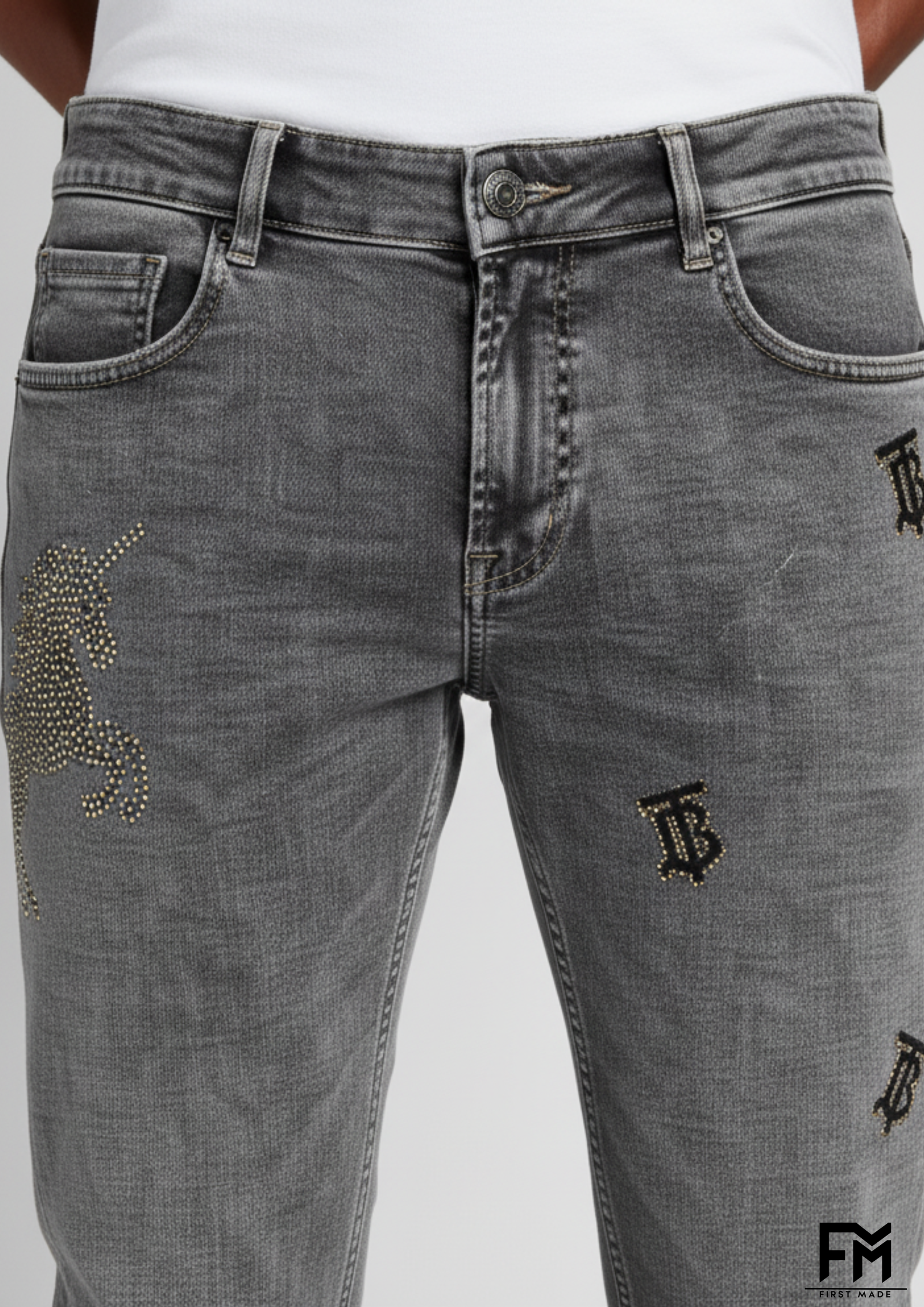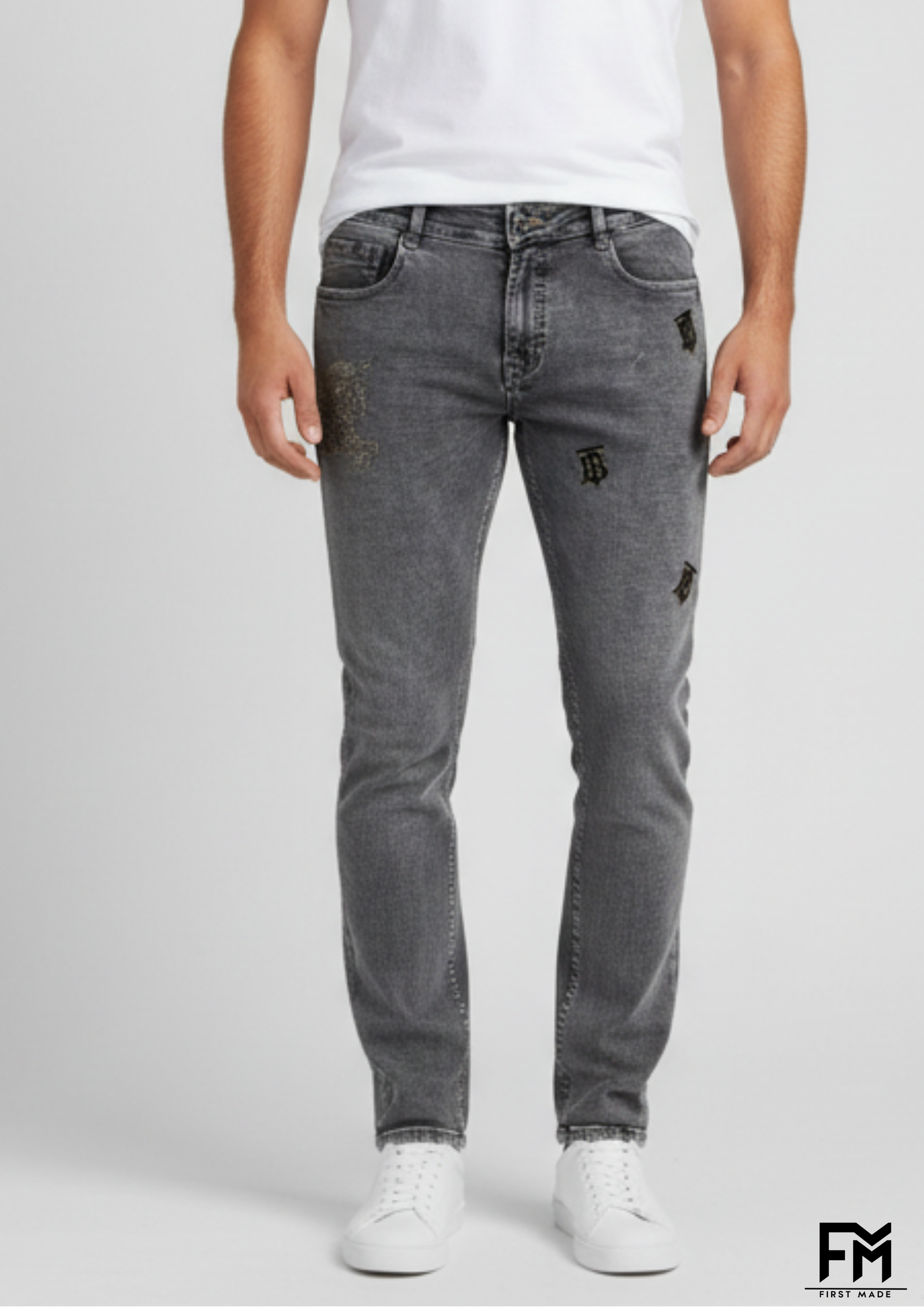 Step into effortless style with FirstMade Classic Grey Washed Jeans, designed for the modern youth who demand both comfort and statement fashion. These jeans are crafted from premium imported denim, ensuring durability and breathability, perfect for all-day wear. The subtle vintage grey wash gives them a rugged yet contemporary appeal, while the unique black monogram prints and distressed detailing add a bold, streetwear-inspired edge.