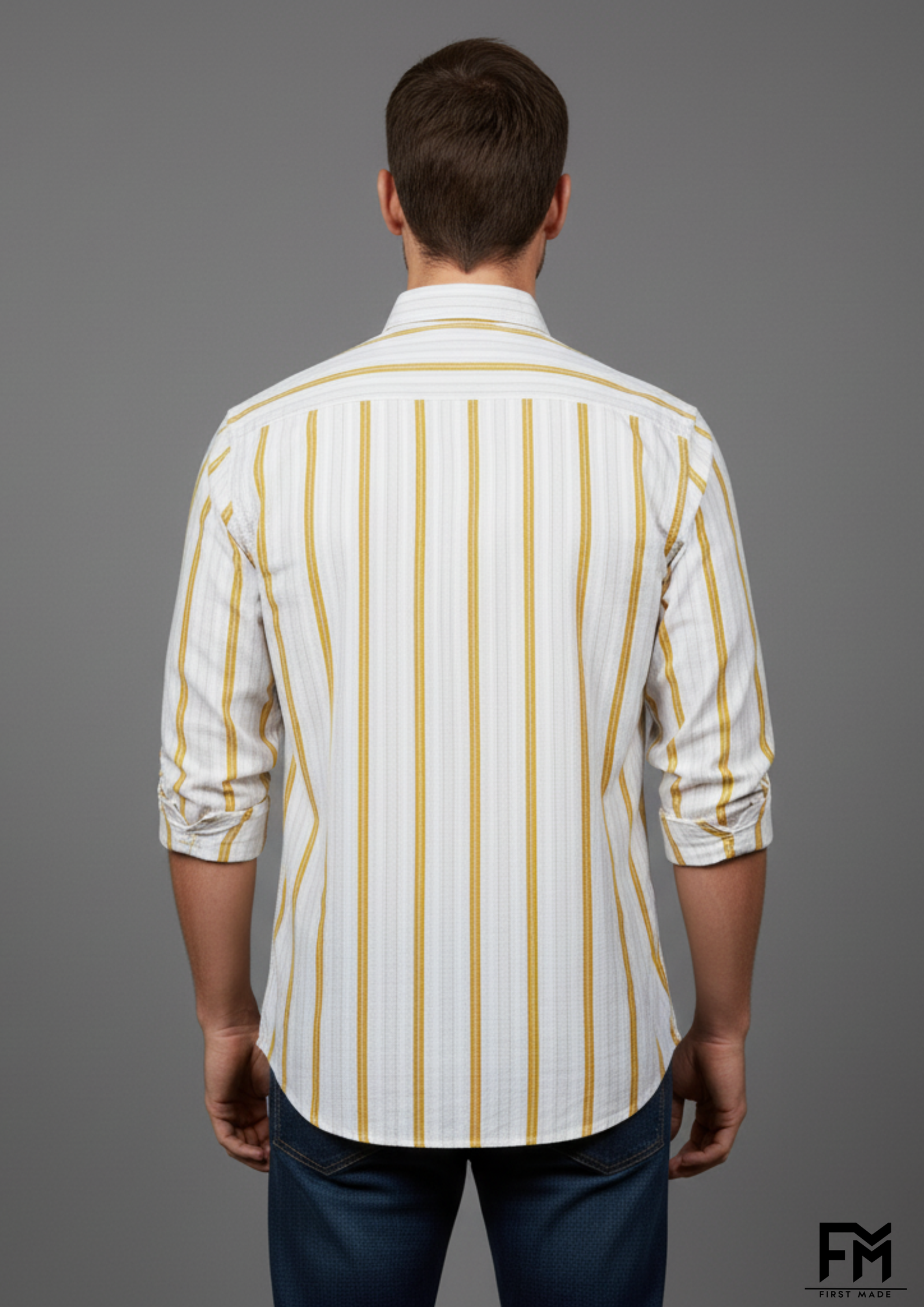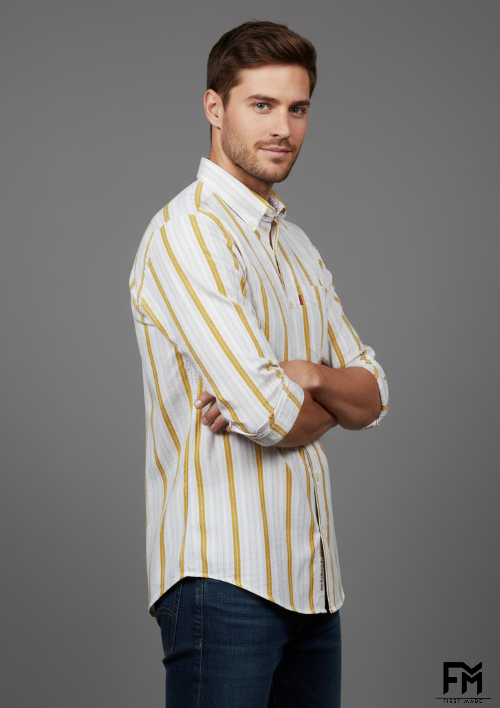 Elevate your everyday style with the Golden Stripe Casual Button-Down Shirt from FM First Made. Designed for men who appreciate effortless sophistication, this shirt features a crisp white base adorned with vertical golden-yellow stripes that create a modern yet timeless appeal. The button-down collar adds a touch of refinement, while the full sleeves can be rolled up for a relaxed, versatile look.