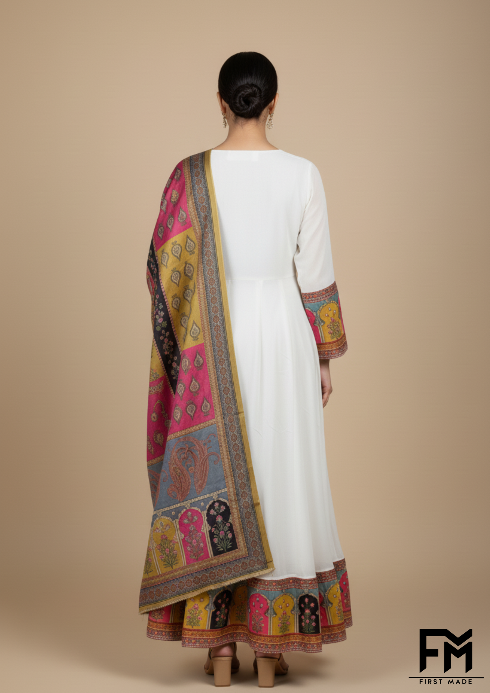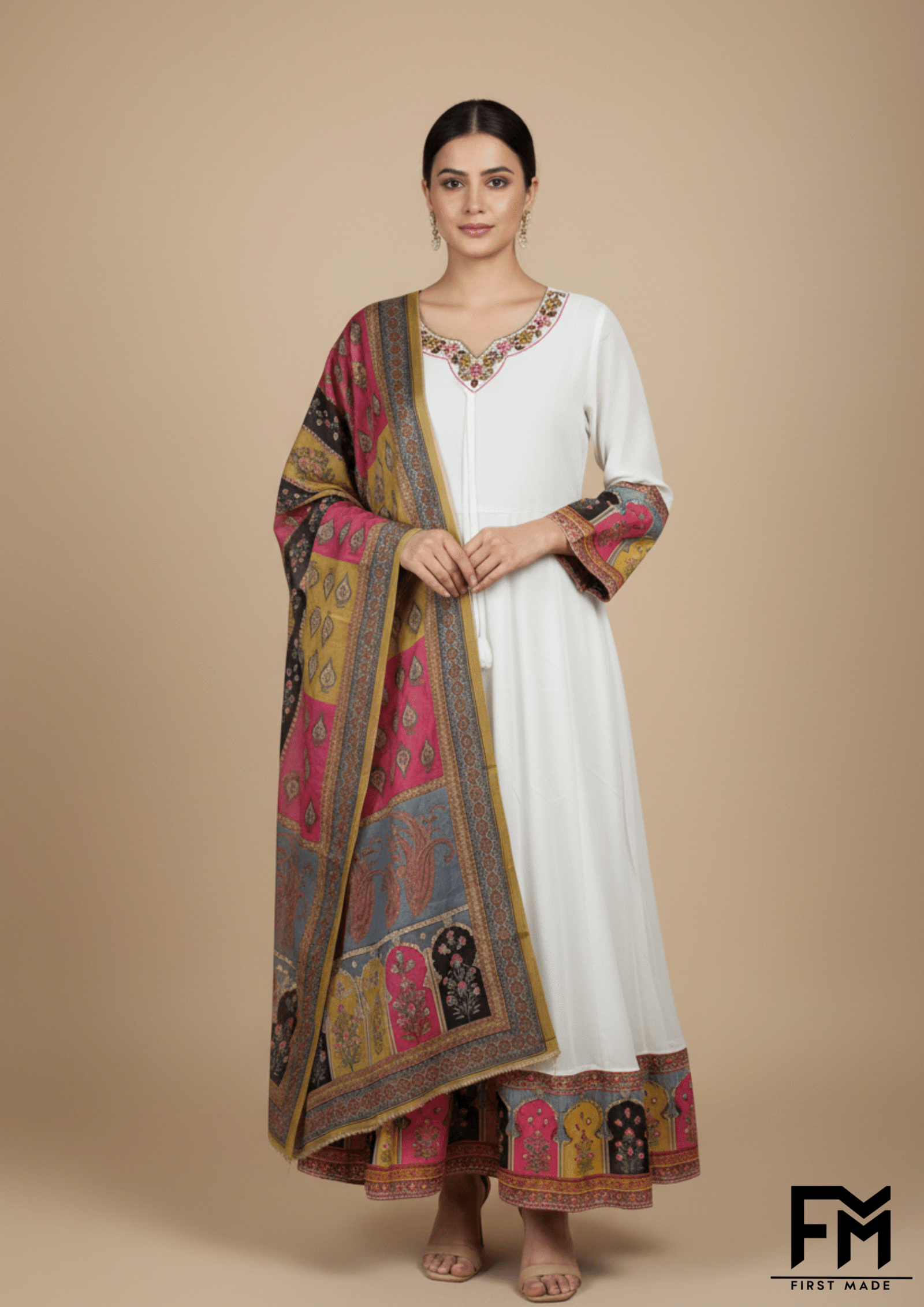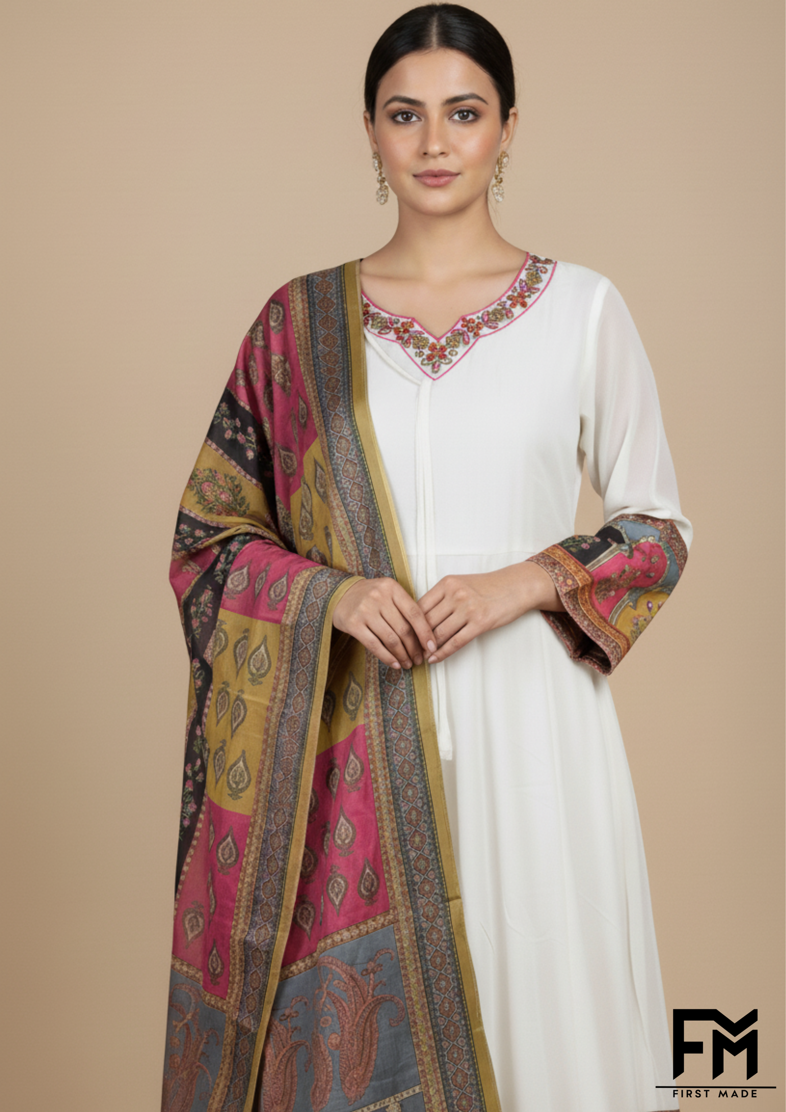 Introducing a breathtaking frock and dupatta set from FM First Made, a true testament to sophisticated style and artistic design. This elegant ensemble features a flowy, full-length frock (Anarkali-style kurta) available in both classic black and pristine white. The frock boasts a round neckline delicately embellished with intricate, colorful embroidery, adding a subtle touch of elegance. Its long sleeves are a highlight, adorned with a vibrant, multi-hued border print that beautifully mirrors the exquisite design of the accompanying dupatta. The hem of the frock also features a stunning, ornate border print, perfectly complementing the sleeves and dupatta. The star of this ensemble is the grand, ornate dupatta, crafted from a luxurious fabric and featuring a stunning array of traditional motifs—paisleys, florals, and architectural elements—in a vibrant color palette of fuchsia, gold, teal, and grey. This versatile set is perfect for celebratory events, formal gatherings, or any occasion where you wish to exude grace and timeless charm.